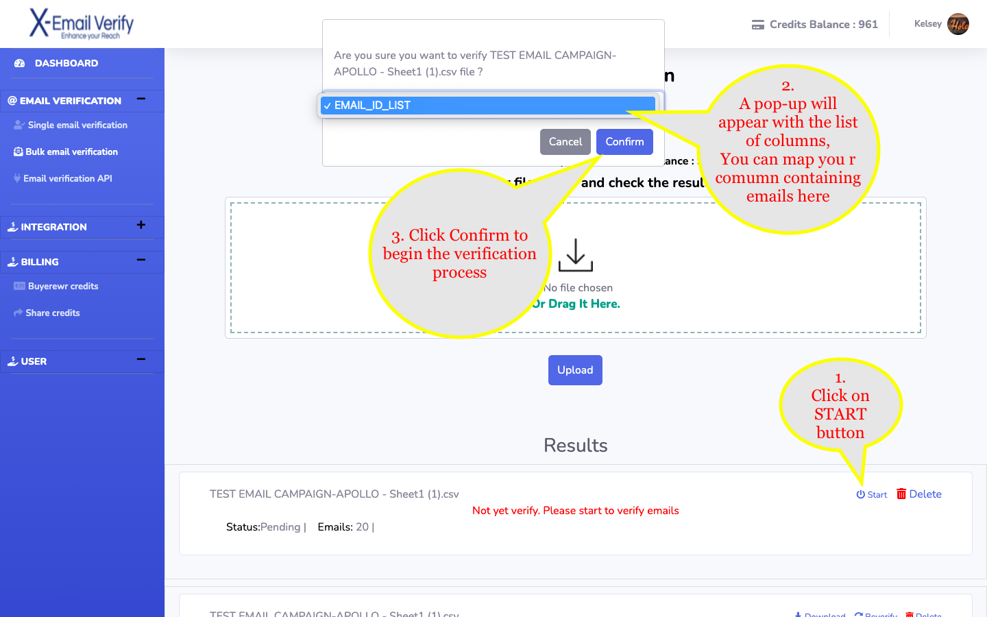 To achieve bulk email verification, follow the below steps, 1. Login to your dashboard 2. Inside LOGIN VERIFICATION section, click BULK EMAIL VERIFICATION 3. Upload your file and click on Start button to initiate the next process Bulk Email ...